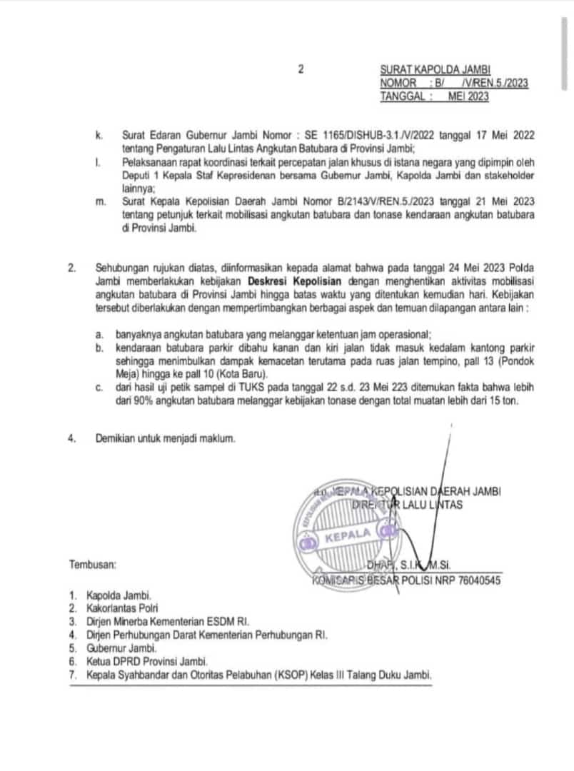 Kombes Pol Dhafi, Direktur Lalu Lintas (Ditlantas) Polda Jambi, mengungkapkan bahwa penghentian operasi pengangkutan batubara ini akan berlaku tanpa batas waktu yang ditentukan. Setelah melakukan rapat dengan KSP (Kantor Staf Presiden), ditetapkan bahwa muatan truk pengangkut batubara tidak boleh melebihi 15 ton, sementara sebelumnya batasnya adalah 11,5 ton.