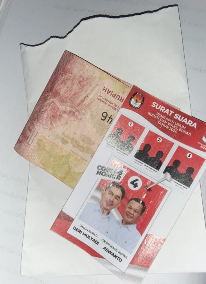 Baru-baru ini beredar sebuah foto di media massa yang memuat spesimen surat suara Paslon Cabub – Cawabub Nomor Urut 4, Deri Mulyadi – Aswanto lengkap dengan amplop berisikan uang Rp 100.000.