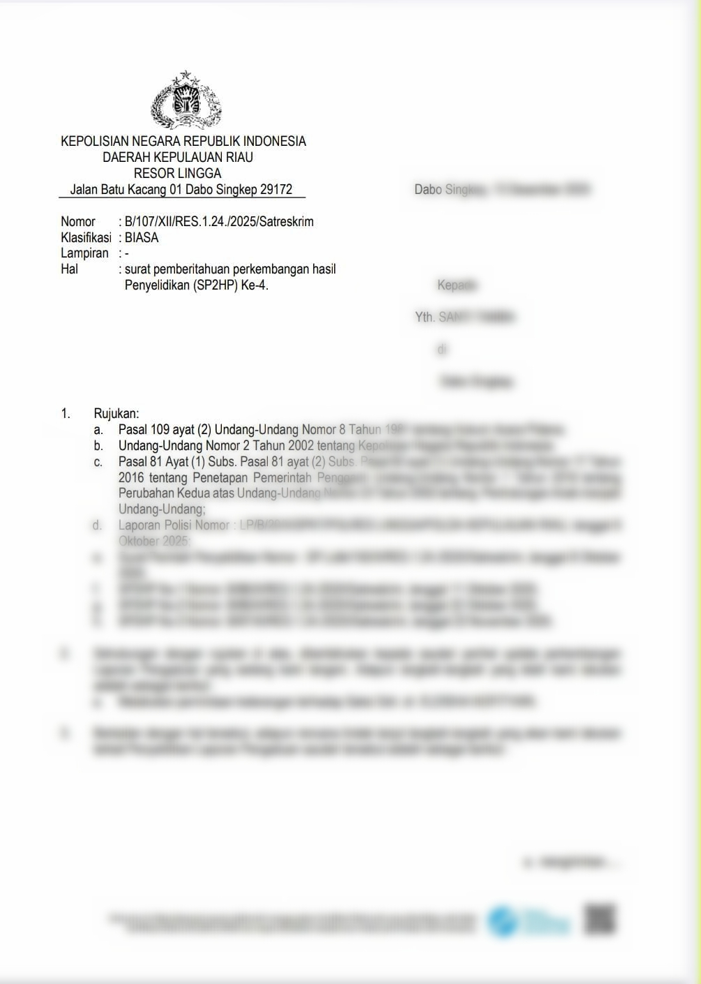Dalam surat tersebut, penyidik merujuk pada laporan polisi LP/B/20/X/SPKT/POLRES LINGGA/POLDA KEPULAUAN RIAU yang teregistrasi pada 6 Oktober 2025, serta surat perintah penyelidikan tertanggal 8 Oktober 2025. SP2HP Ke-4 itu juga mencatat adanya pembaruan langkah penyelidikan yang telah dilakukan.